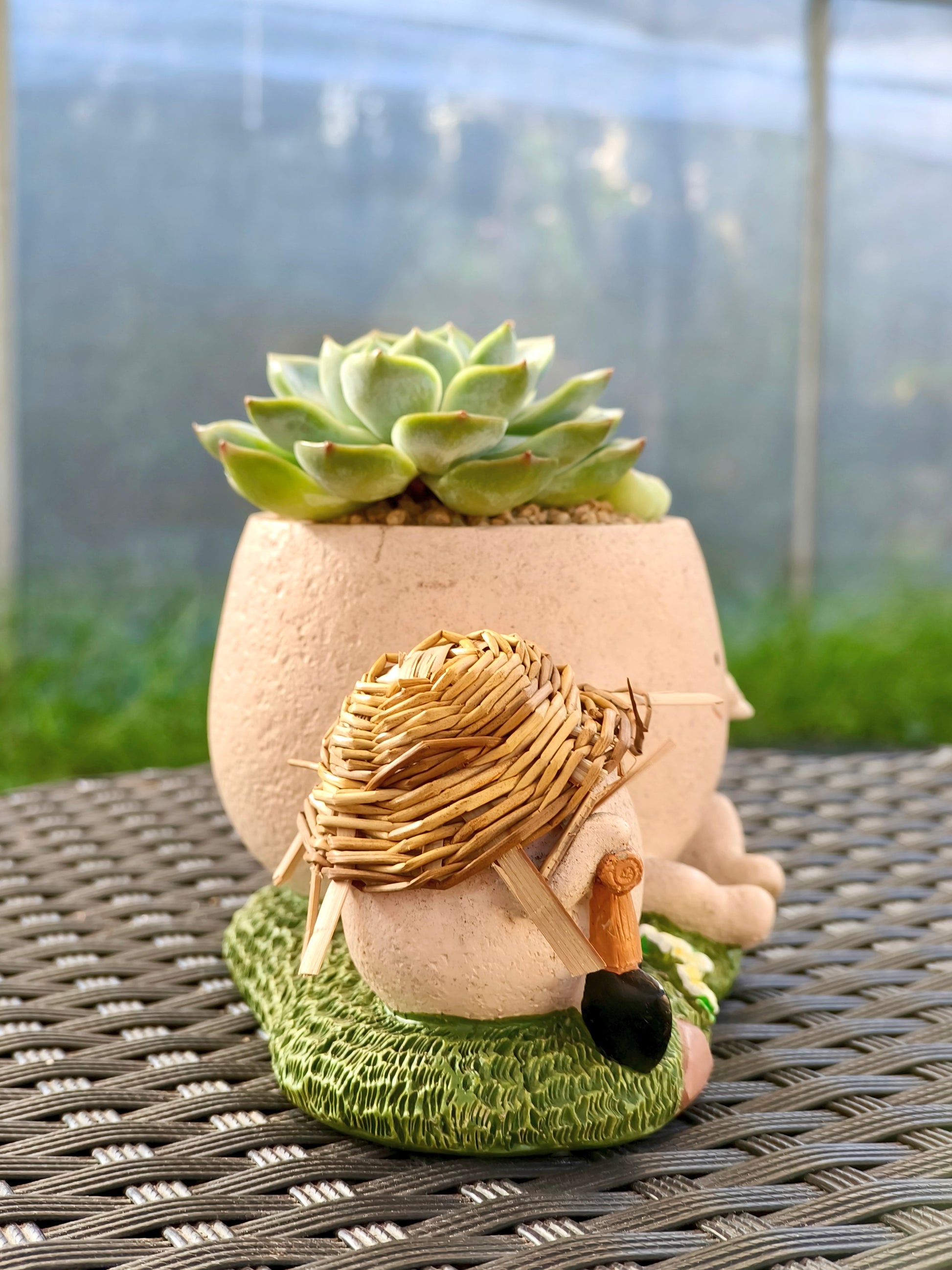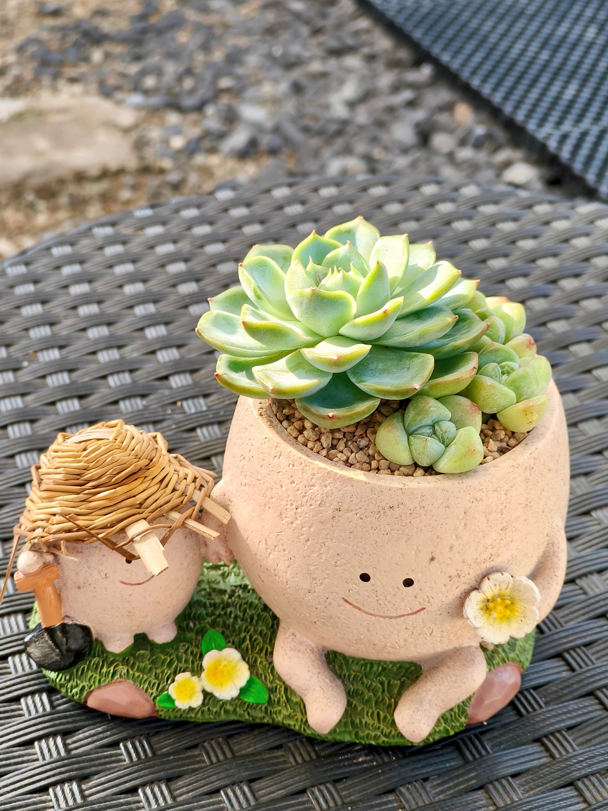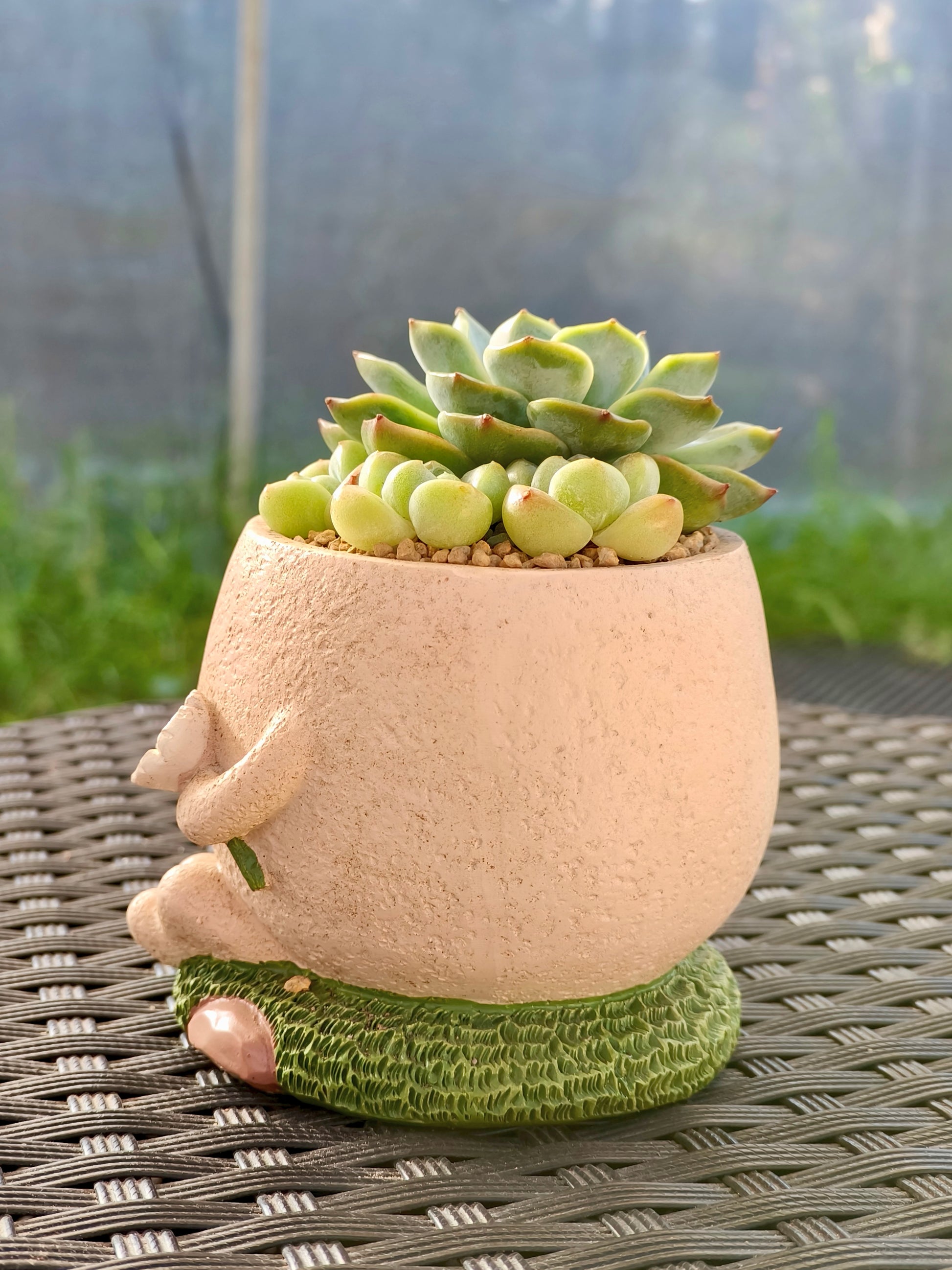 Crowning the figures is the Echeveria Ice Green, accompanied by three chubby baby offsets, creating a delightful cluster of soft, frosted minty rosettes. The combination of quirky figures and vibrant succulents makes this piece a perfect accent for shelves, desks, or windowsills.