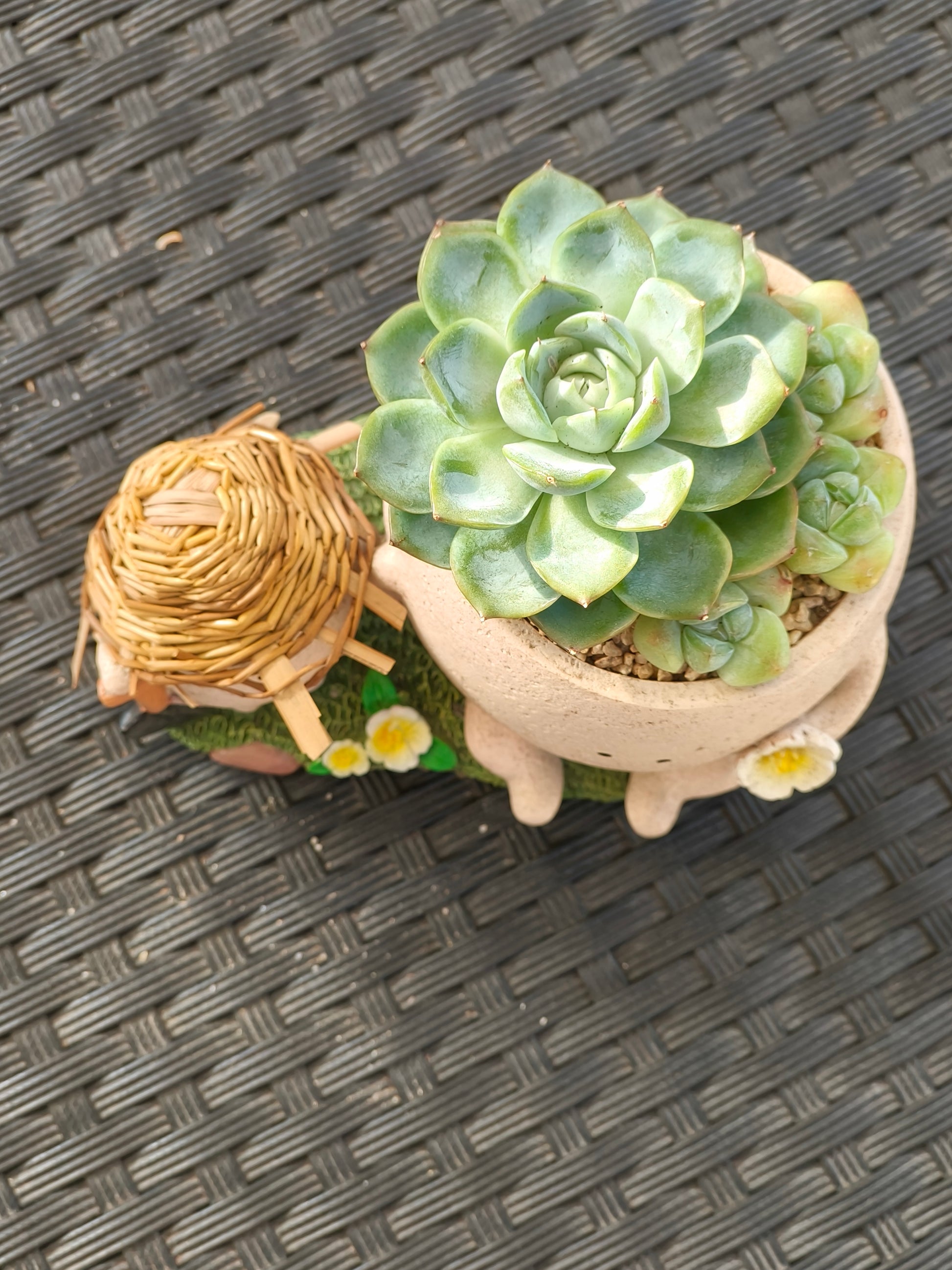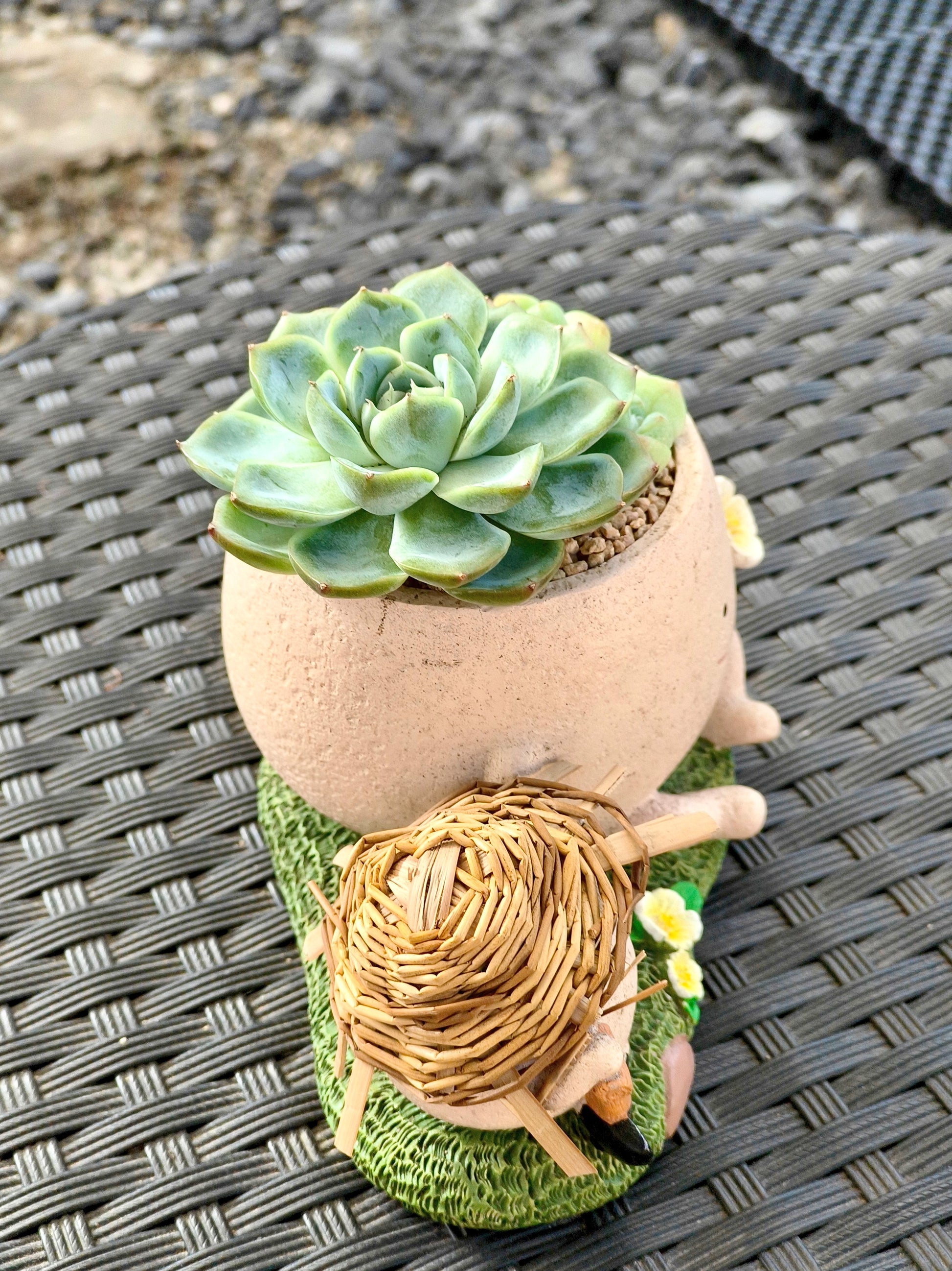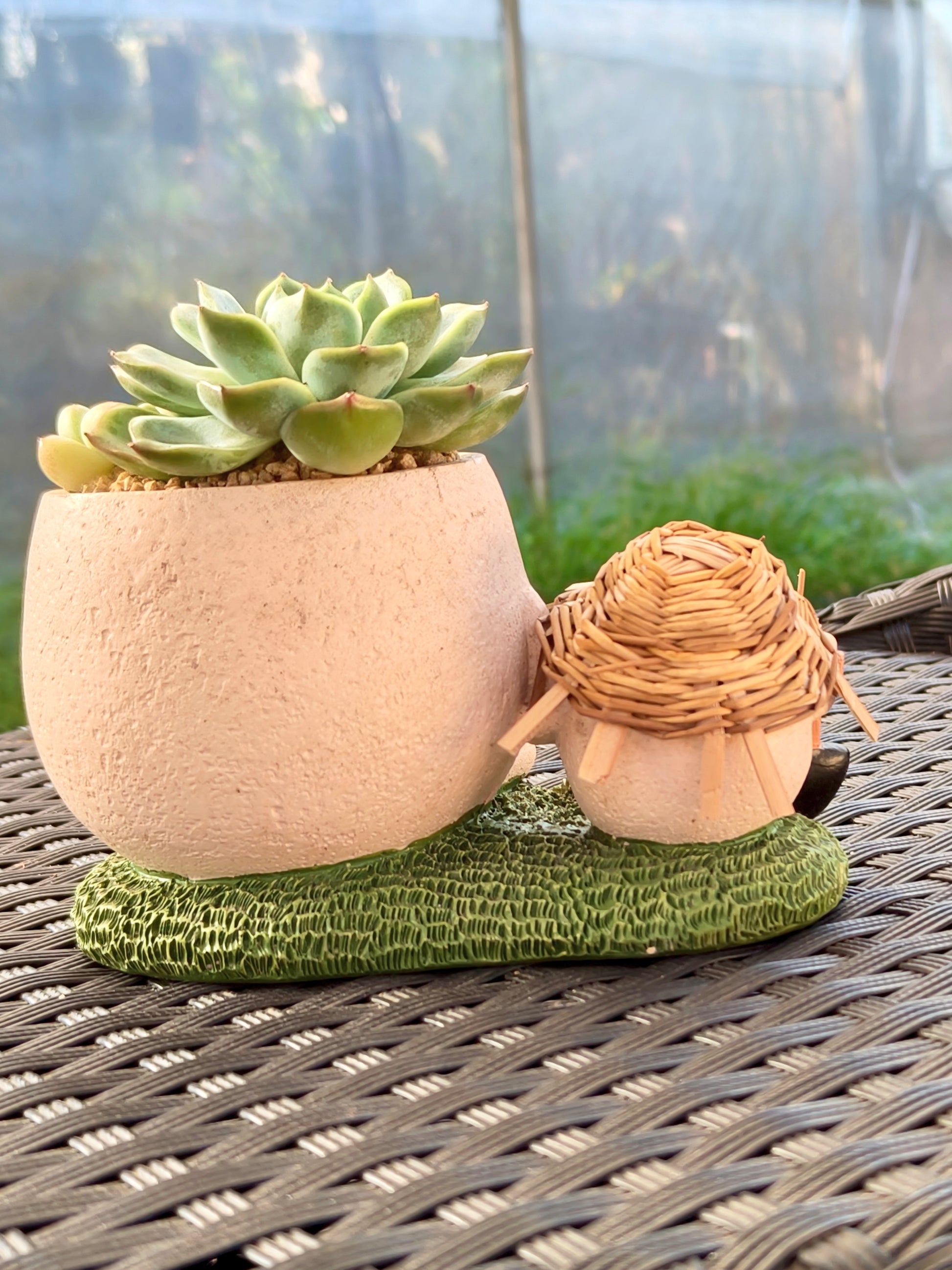 Crowning the figures is the Echeveria Ice Green, accompanied by three chubby baby offsets, creating a delightful cluster of soft, frosted minty rosettes. The combination of quirky figures and vibrant succulents makes this piece a perfect accent for shelves, desks, or windowsills.