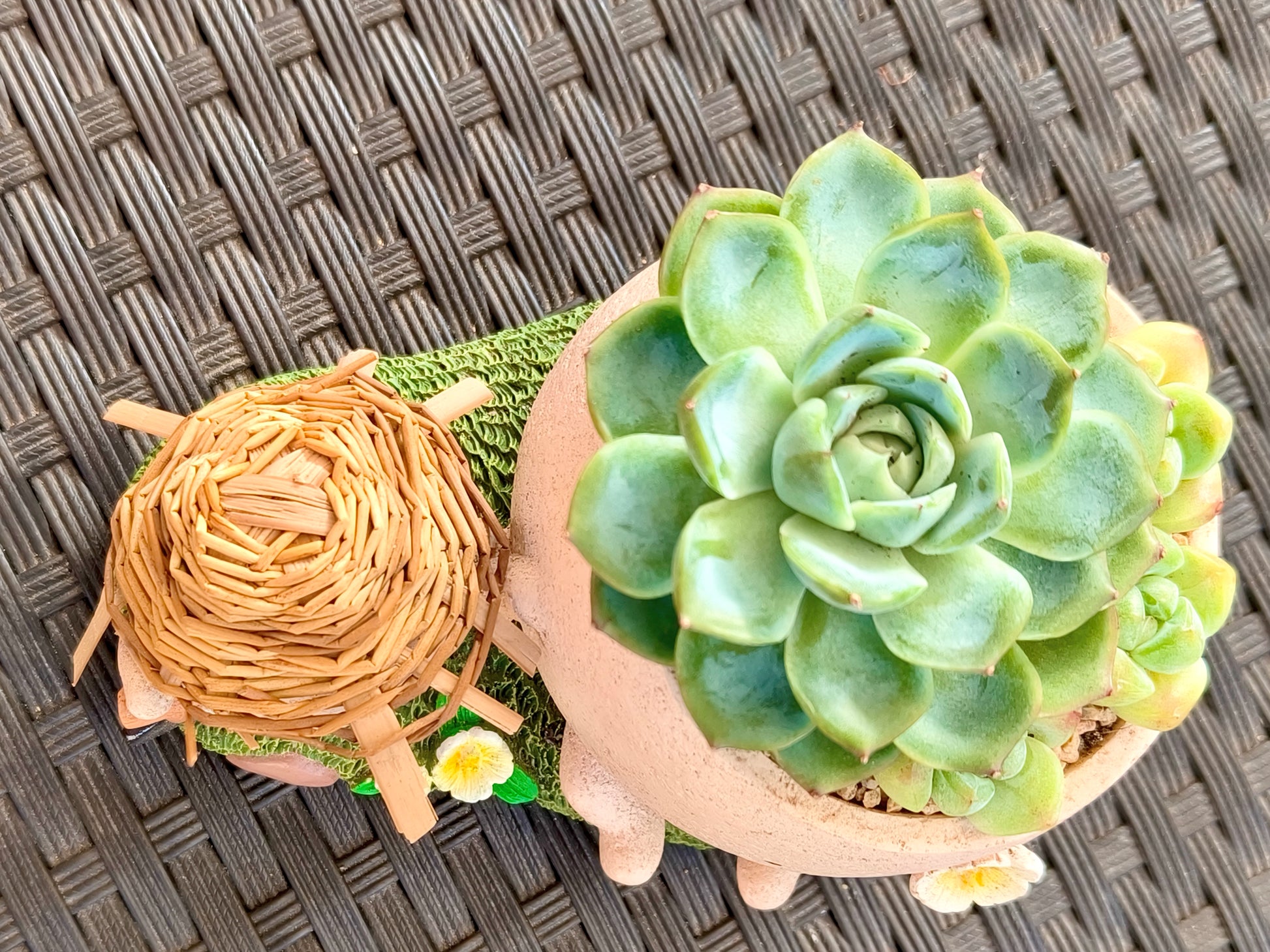 Add a touch of whimsy and charm to any space with the Succulent Buddies Planter. Featuring two cheerful, smiling figures set on a grassy base with tiny blossoms, this playful arrangement brings a storybook-like scene to life.