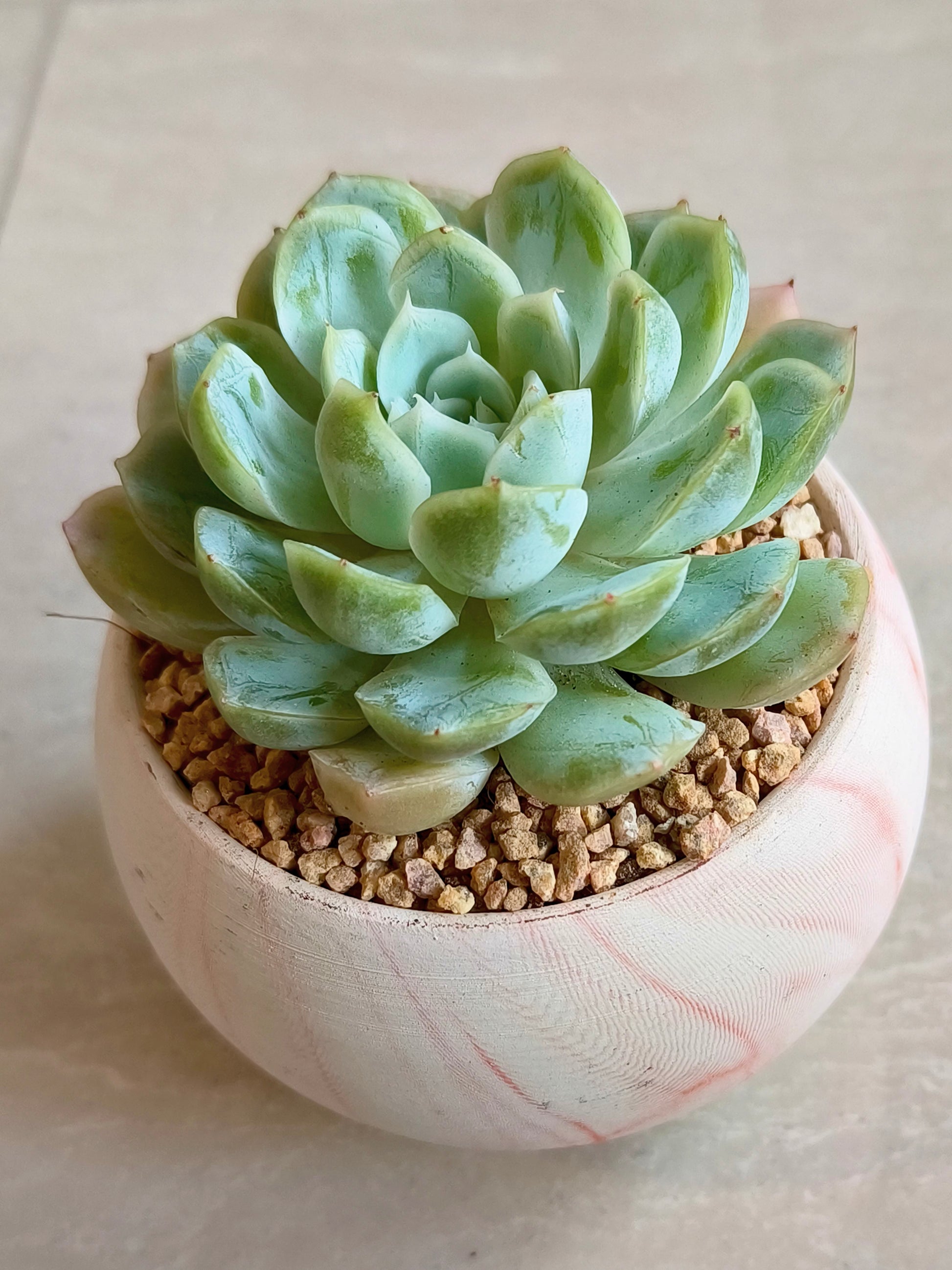 A soft, pastel rosette meets a warm pop of colour in this Succulent Elegant Round Orange Planter. The Echeveria Elegans ‘Mexican Snowball’ features powdery blue-green leaves with a naturally gentle symmetry, creating a calming contrast against the smooth orange ceramic planter. A beautiful pick for brightening desks, shelves, or gifting moments.