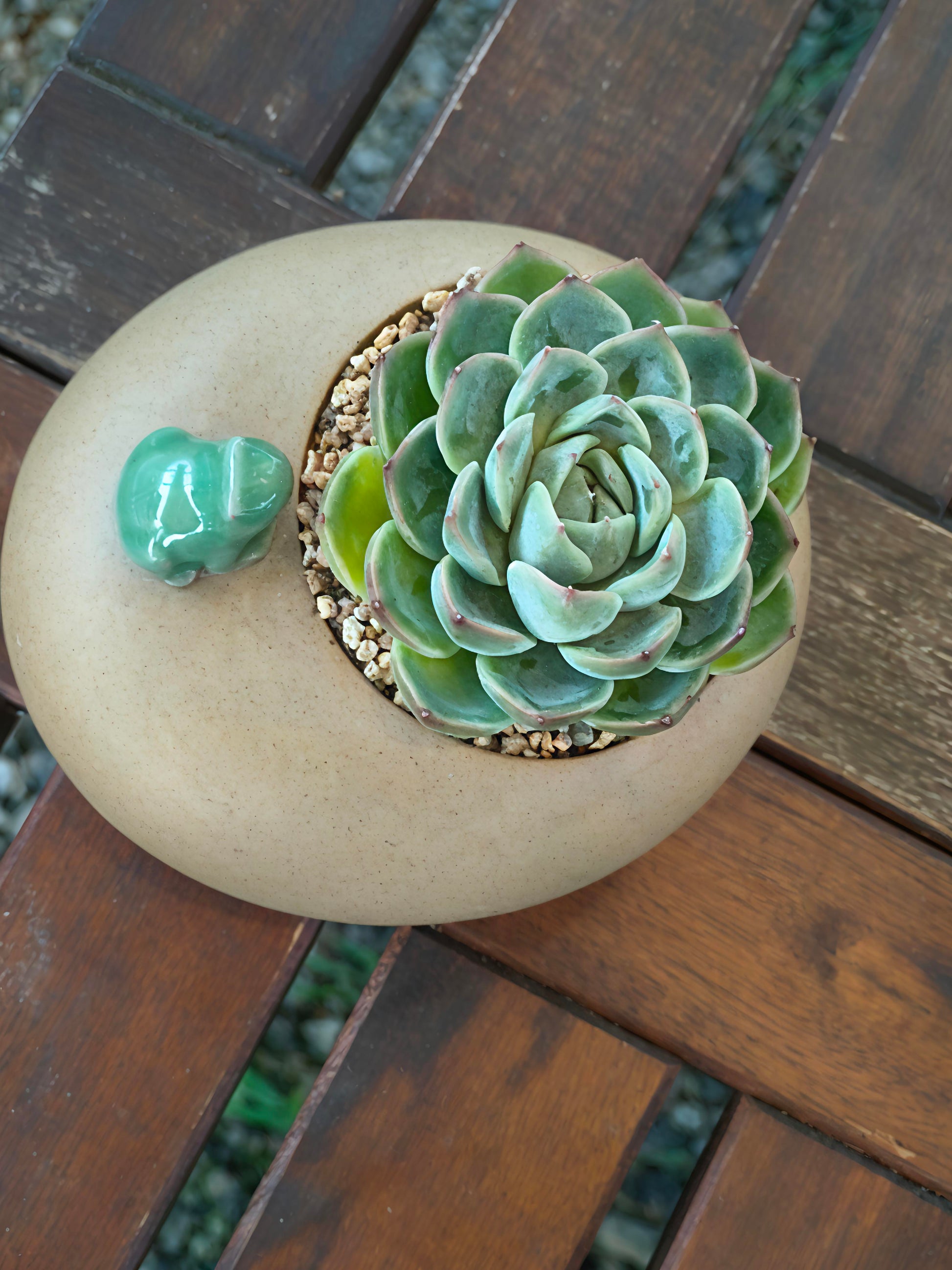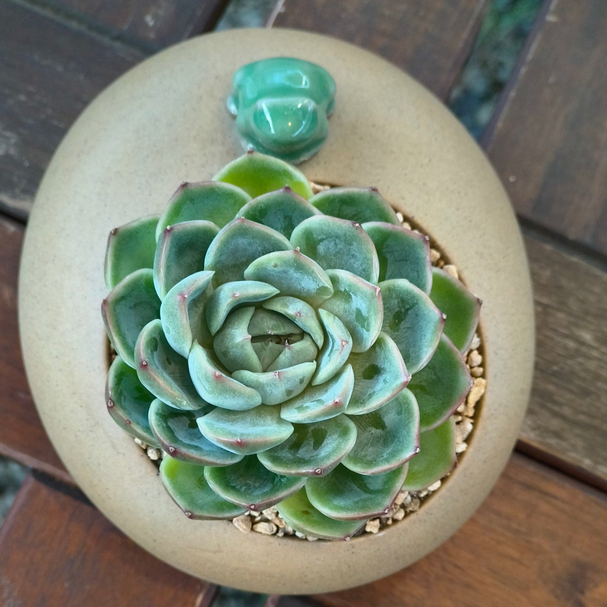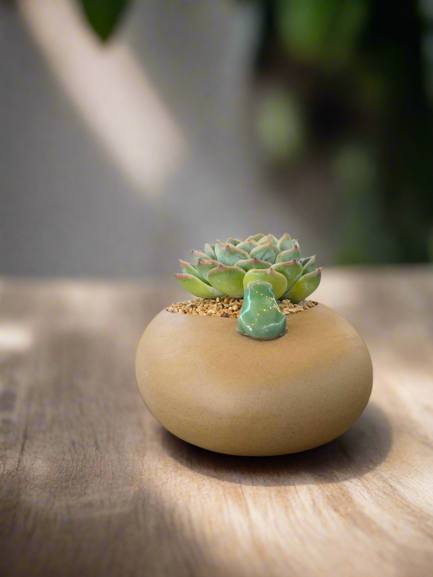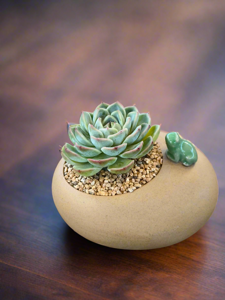 Cradled inside is a beautiful Echeveria 'Onslow', known for its perfectly formed rosettes and subtle blush of color. Low maintenance and sun-loving, it's a plant that thrives quietly—just like the frog it accompanies.