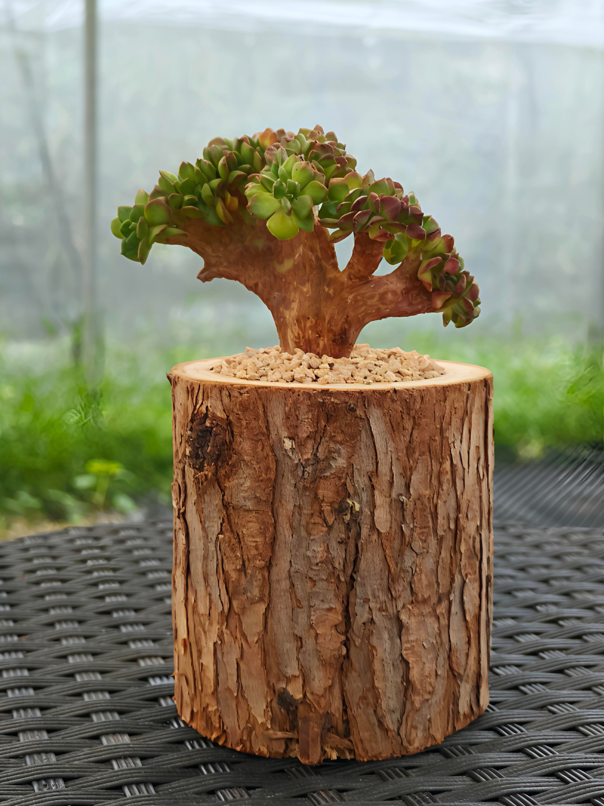At its heart grows the rare Crested Lety’s Sedeveria, a sculptural succulent with wave-like crests that resemble a miniature bonsai. Its unique form paired with the rugged bark creates a stunning harmony of nature’s artistry.