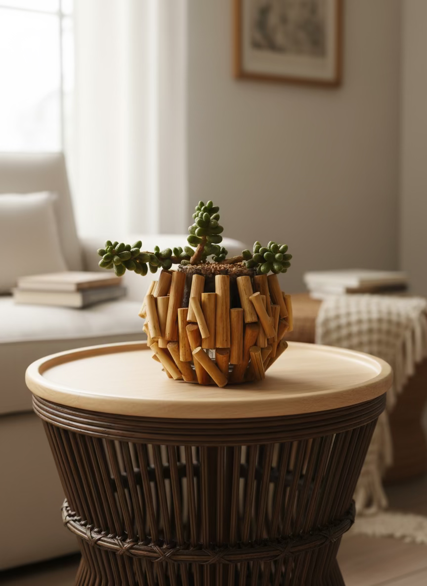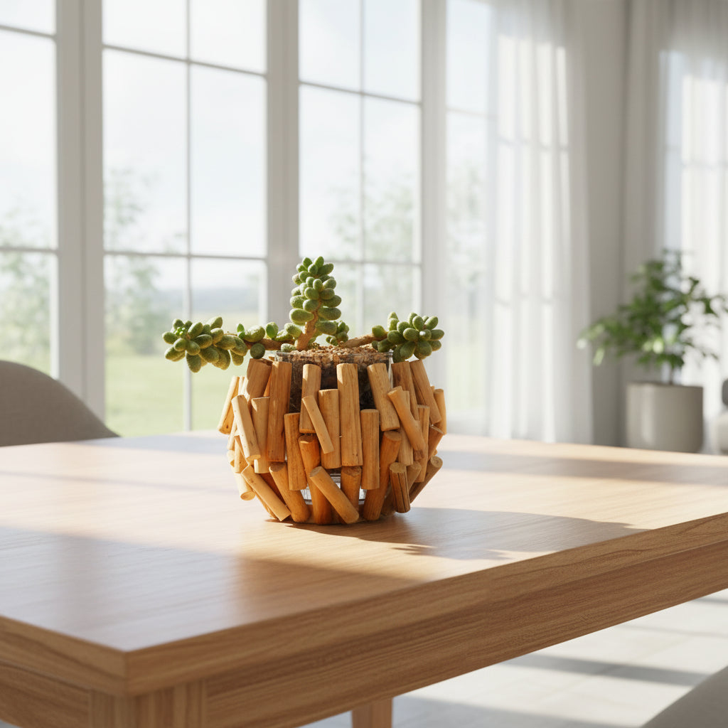 This piece features a lush Sedum hernandezii, known for its plump, jellybean-like leaves and cheerful personality, cradled in a unique round cachepot carefully constructed from light-toned wooden sticks of varying heights. Each wooden dowel is hand-arranged vertically to form a beautifully rustic silhouette—bringing organic texture and earthy elegance into your space.