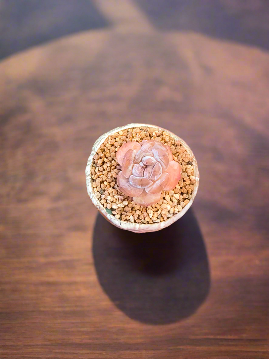 Nestled within is Echeveria 'Cosette', a soft and symmetrical rosette with pastel-blushed leaves. Elegant yet low maintenance, it pairs naturally with the rich tones of the pot, creating a balanced and soulful display.