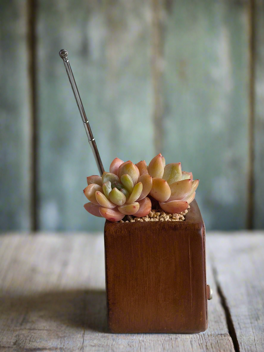 Succulent Retro Radio Planter – Echeveria 'Pink Ariel Crest' & Echeveria Hybrid