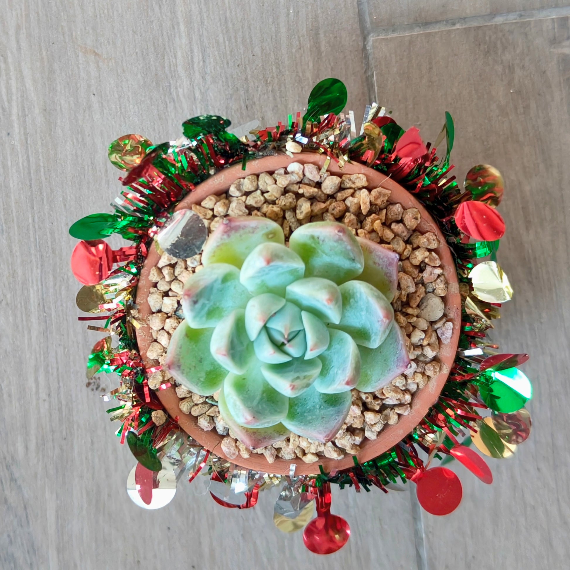 Celebrate the season with the Simply Blessed Festive Terracotta set — a charming trio of succulents dressed in classic Christmas cheer. Each plant is rooted in an unglazed terracotta planter, wrapped with a sparkling garland of red, gold, green, and silver sequins that instantly brings out the warmth of the holidays. These petite pieces make thoughtful gifts, table accents, or meaningful blessings to share with loved ones this festive season.