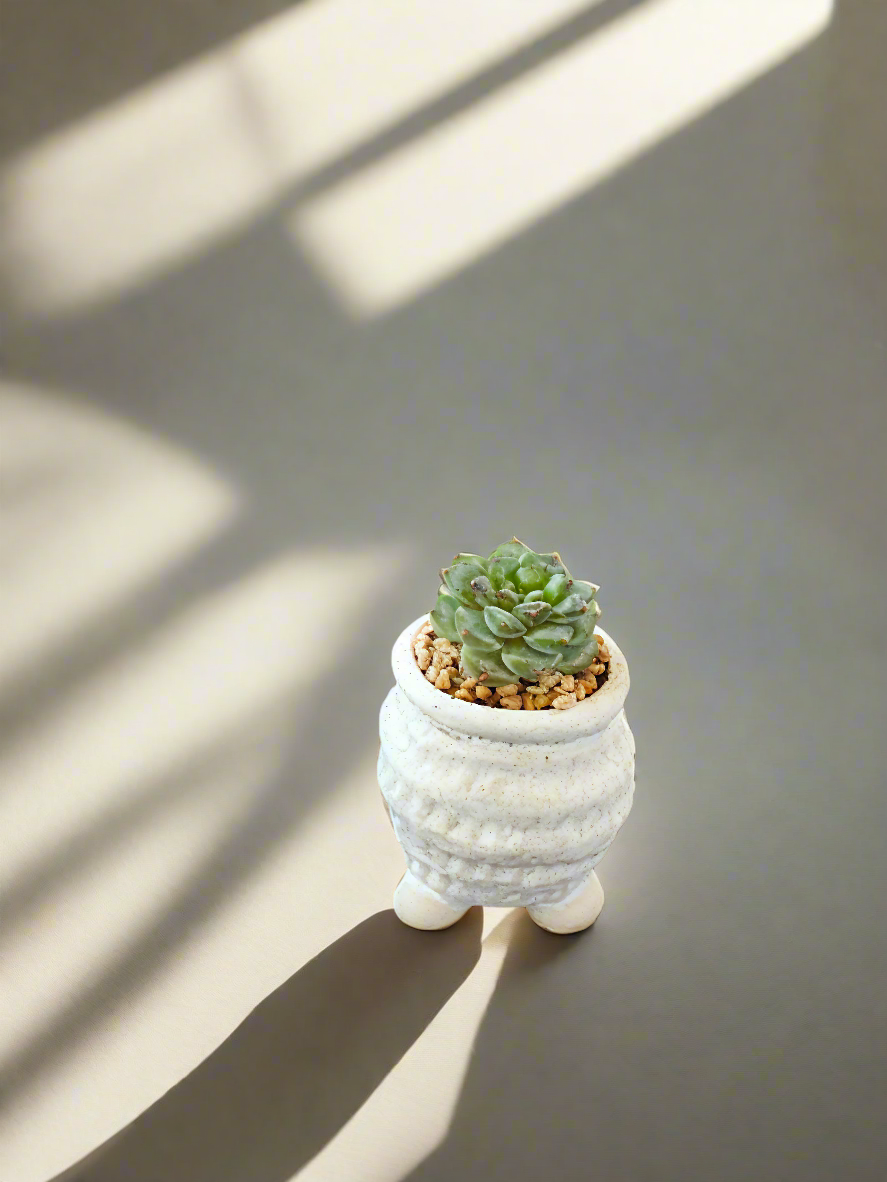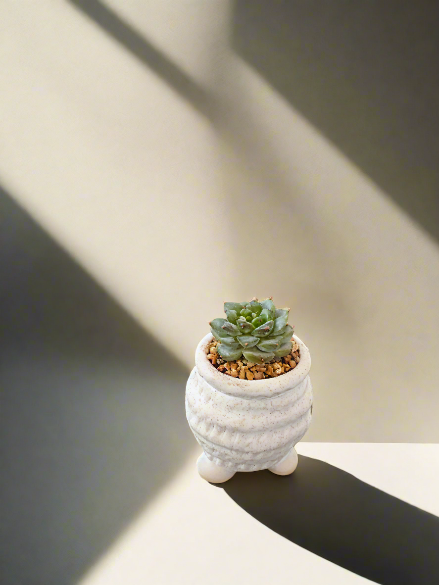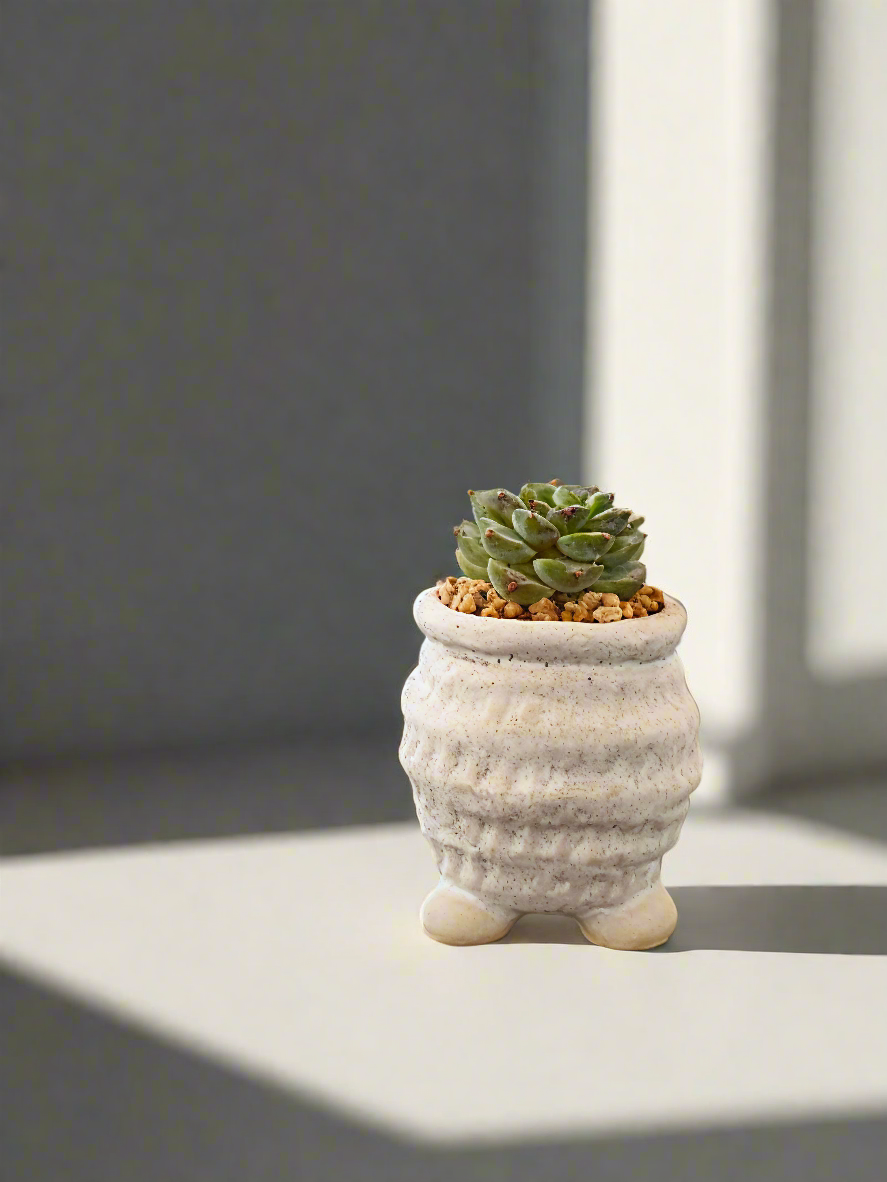 From our Tiny Roots Collection, this charming miniature planter stands proudly on three little feet, exuding quiet character and natural warmth. Its soft, off-white glaze and handcrafted texture give it an earthy, organic feel — perfectly complementing the delicate rosettes of the Echeveria 'Red Velvet' it holds.