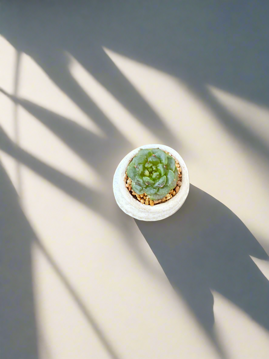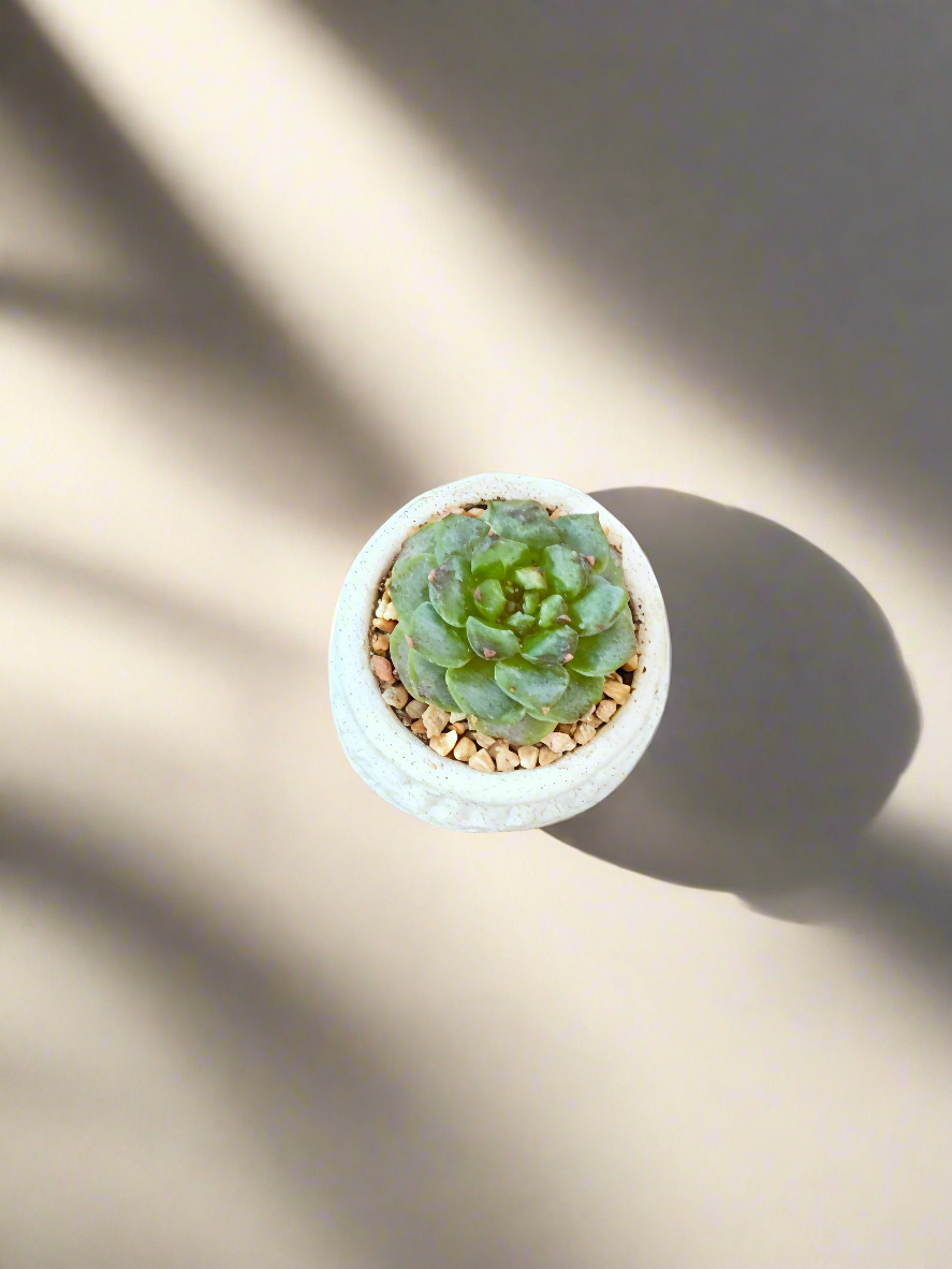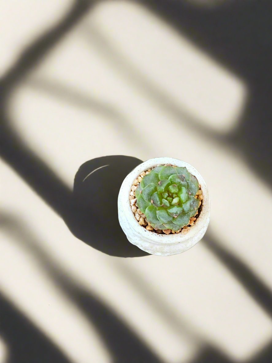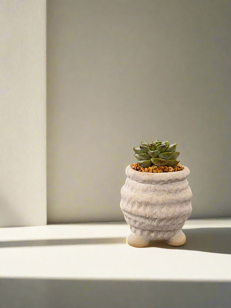 From our Tiny Roots Collection, this charming miniature planter stands proudly on three little feet, exuding quiet character and natural warmth. Its soft, off-white glaze and handcrafted texture give it an earthy, organic feel — perfectly complementing the delicate rosettes of the Echeveria 'Red Velvet' it holds.